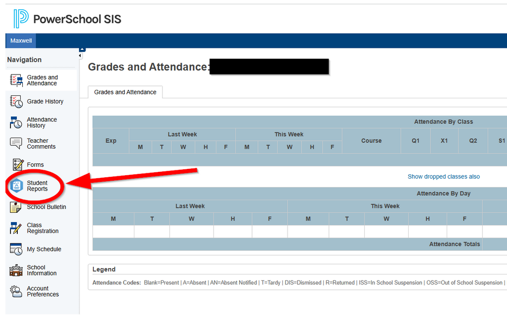 Step #2: After logging in, you should see the screen below. You will be on the Grades and Attendance side tab. You want to click on Student Reports.